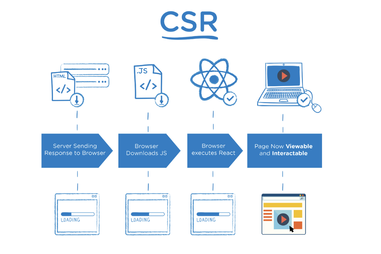 - CSR은 위의 프로세스를 모두 끝마친 후에, 가상돔을 브라우저 돔으로 옮겨야 비로소 페이지를 볼 수 있다.