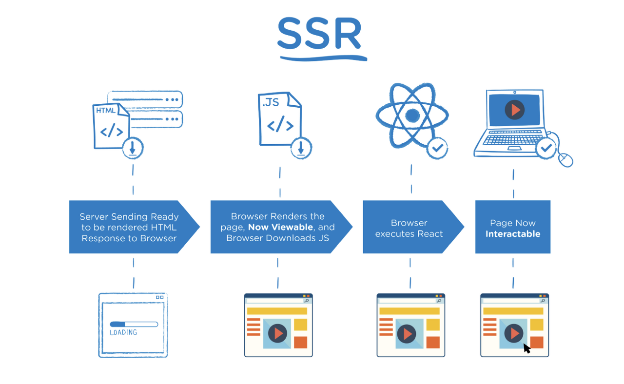 - SSR, CSR모두 React를 다운로드하고, 가상돔 구축하고 이벤트 첨부해서 페이지를 interactable하게 만드는 process는 동일하게 거쳐야 한다.