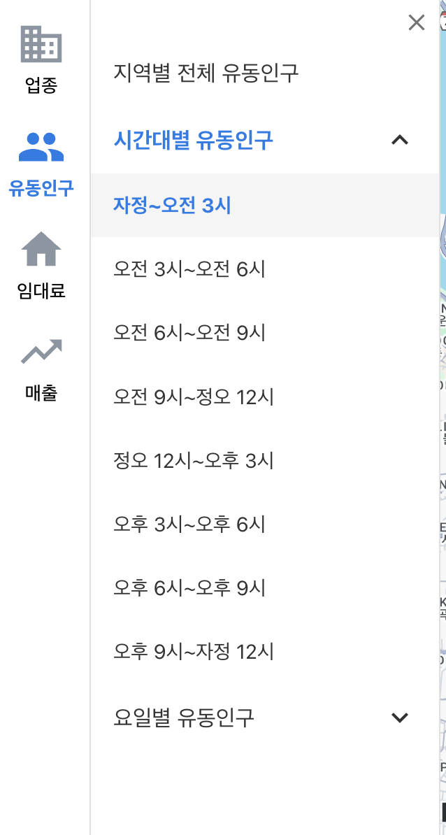 '시간대별 유동인구' 를 subMenu에 추가해주고, 클릭하면 드롭다운 형태로 밑에 하위 메뉴가 나오도록 해줘. 하위 메뉴는 0~23 까지 time_period 이며, 0이 자정부터 새벽 세시, 1이 새벽 세시부터 아침 6시 이렇게 3시간 간격이야